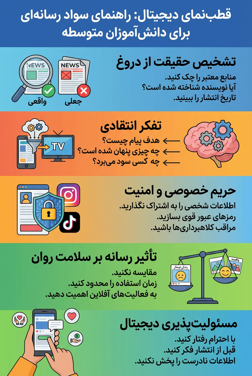 در دنیای دیجیتال هر خبر واقعی نیست؛ منبع را حتماً بررسی کنید. نویسنده، هدف پیام و تاریخ انتشار را همیشه چک کنید. رسانهها فقط اطلاعات نمیدهند؛ جهتگیری هم دارند. قبل از باور یا بازنشر، از خودتان بپرسید چه کسی سود میبرد. اطلاعات شخصی را در شبکههای اجتماعی منتشر نکنید. برای حسابهای خود رمزهای قوی و متفاوت بسازید. فریب لینکها و درخواستهای مشکوک را نخورید. رسانه میتواند بر روحیه شما اثر بگذارد؛ مقایسه نکنید و زمان مصرف را کنترل کنید. فعالیتهای آفلاین را جدی بگیرید تا تعادل روانی حفظ شود. در فضای دیجیتال مسئولانه رفتار کنید و هیچ اطلاعات نادرستی را پخش نکنید.