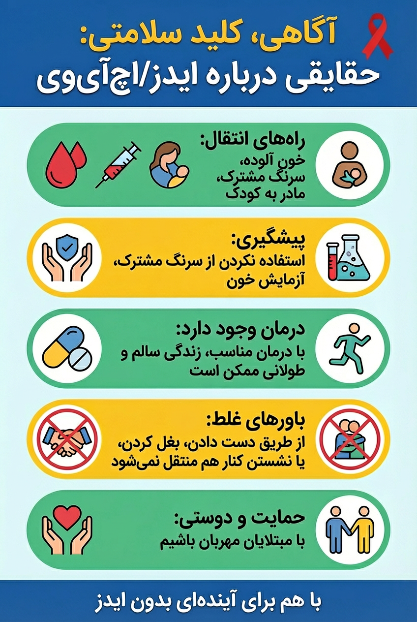 آزمایش خون، تنها راه تشخیص قطعی اچآیوی است. ترس از انگ و تبعیض، مانع بزرگی برای آزمایش و درمان است. همه ما باید با آموزش دقیق، باورهای نادرست را تصحیح کنیم و با افراد مبتلا با احترام و محبت رفتار کنیم. پیشگیری از طریق آگاهی، اجتناب از رفتارهای پرخطر و استفاده از وسایل محافظتی کلیدی است. به یاد داشته باشیم: شریک زندگی من، رفتارهای پرخطر من است، نه افراد مبتلا.