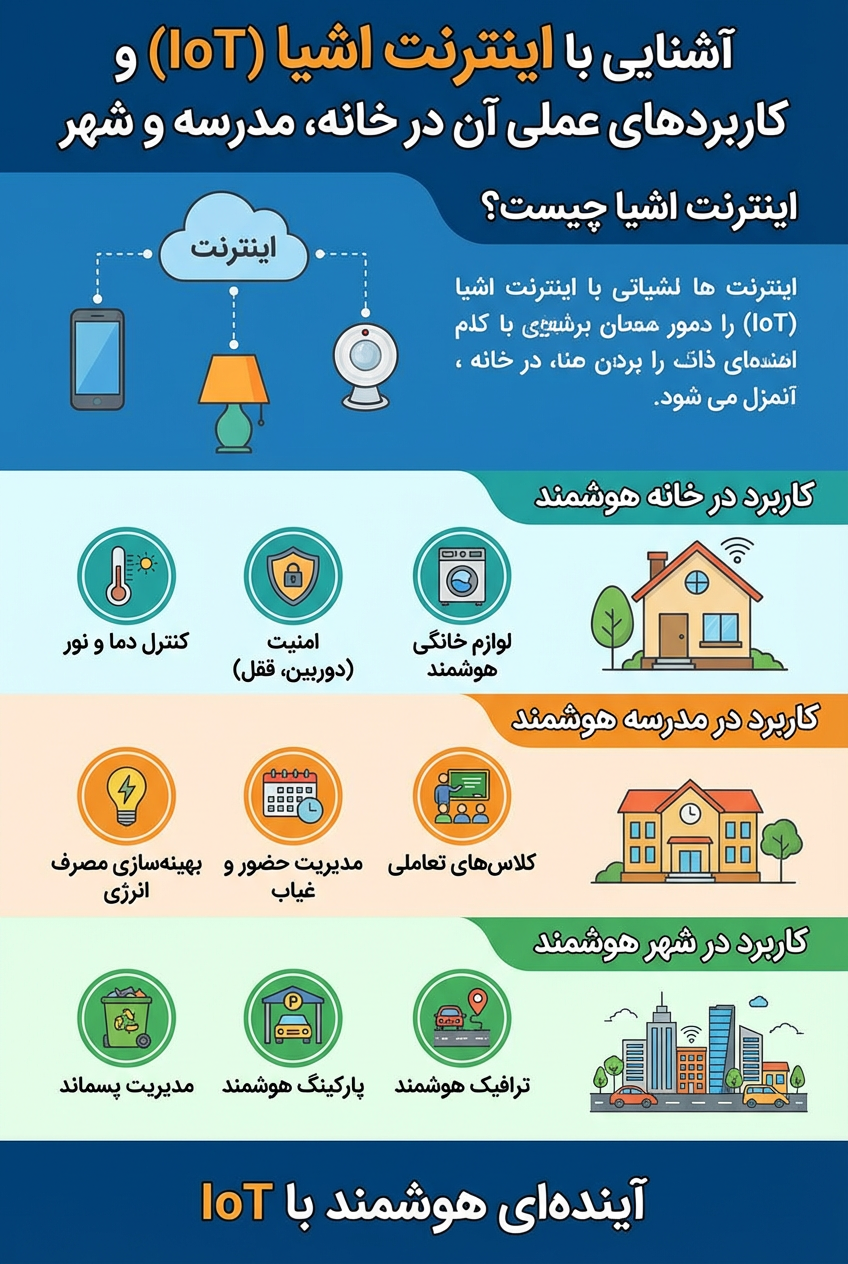 اینترنت اشیا مجموعهای از دستگاههاست که بدون دخالت انسان با هم ارتباط دارند. این فناوری دادهها را جمعآوری میکند و تصمیمهای هوشمند میگیرد. در خانه، روشنایی و گرمایش میتوانند خودکار و کممصرف شوند. یخچالهای هوشمند موجودی را کنترل میکنند و هشدار میدهند. در مدرسه، حضور و غیاب میتواند خودکار و دقیق ثبت شود. تجهیزات آموزشی هوشمند کیفیت یادگیری را افزایش میدهند. در شهر، چراغهای راهنمایی هوشمند ترافیک را بهینه میکنند. حسگرهای محیطی آلودگی هوا و صدا را اندازهگیری میکنند. مدیریت هوشمند انرژی هزینهها را کاهش میدهد. اینترنت اشیا زندگی روزمره را کارآمدتر و ایمنتر میکند.