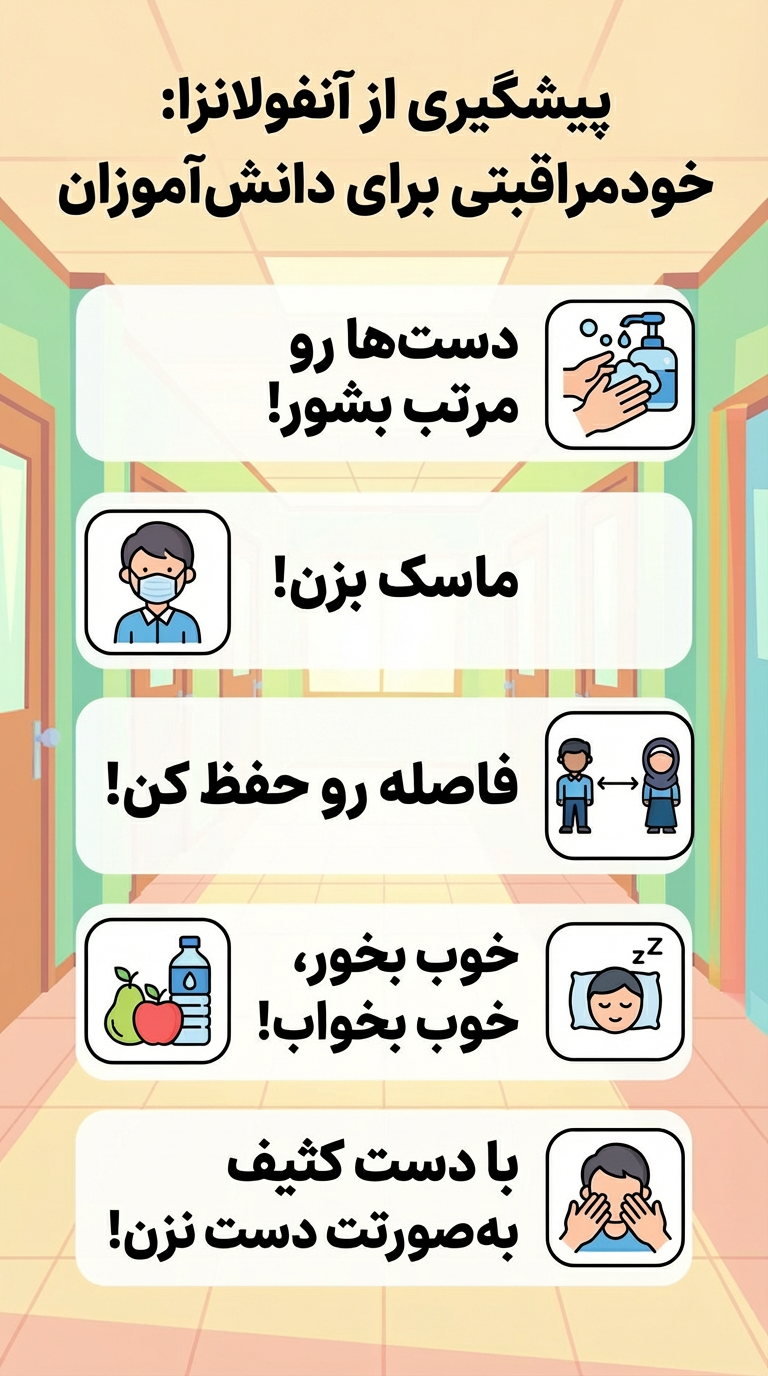 با رعایت این نکات ساده اما حیاتی، نه تنها از خود مراقبت میکنید، بلکه مسئولیتی اجتماعی در قبال سلامت همکلاسیها، همکاران و به ویژه سالمندان و افراد دارای بیماریهای زمینهای ادا مینمایید. پیشگیری از آنفولانزا، انتخاب یک عادت هوشمندانه برای زندگی سالمتر است.